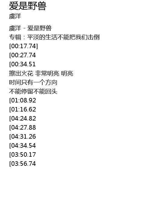 | [00:02.74] | 虞洋 - 爱是野兽 |