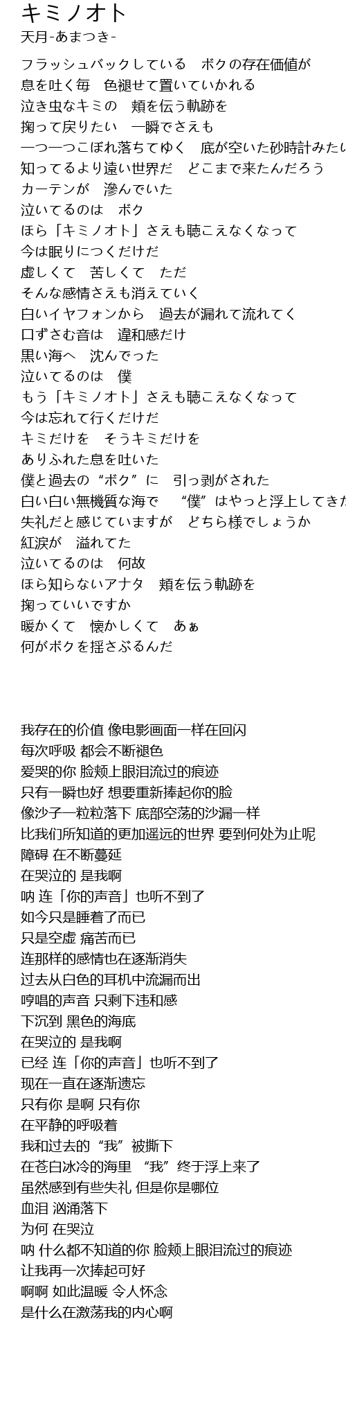 | [02:18.84] | もう「キミノオト」さえも聴こえなくなって |