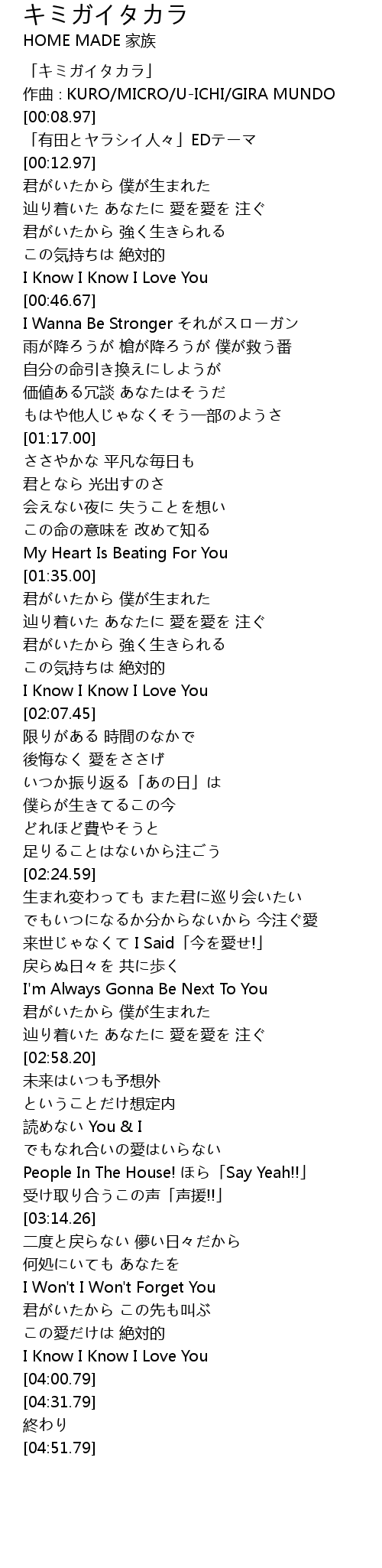 | [00:00.97] | 「キミガイタカラ」 |