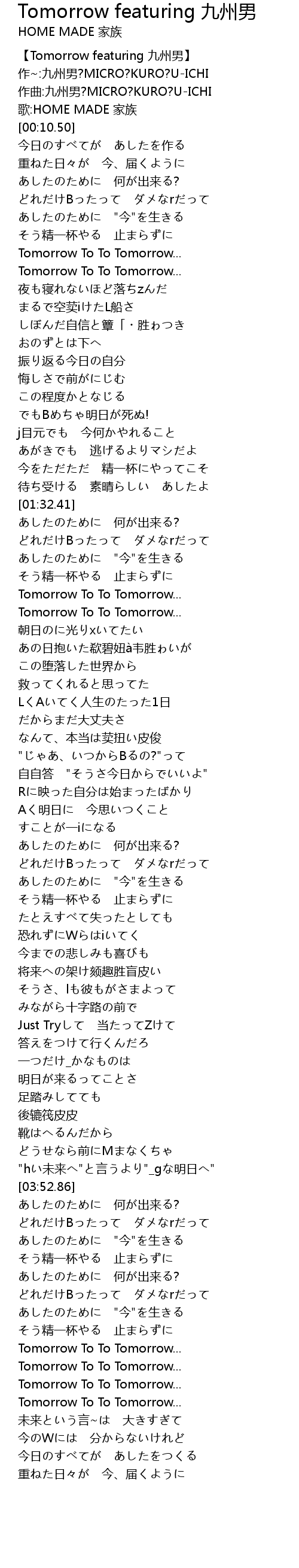| [00:03.25] | 【Tomorrow featuring 九州男】 |