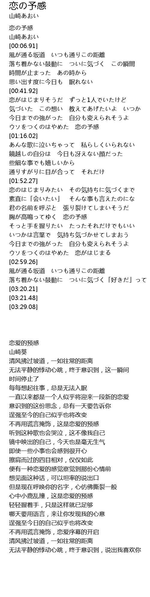 | [00:42.40] | 恋がはじまりそうだ ずっと1人でいたけど |