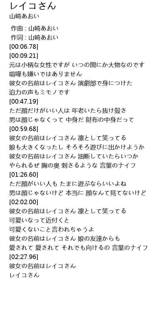| [02:04.89] | 彼女の名前はレイコさん 凛として笑ってる |