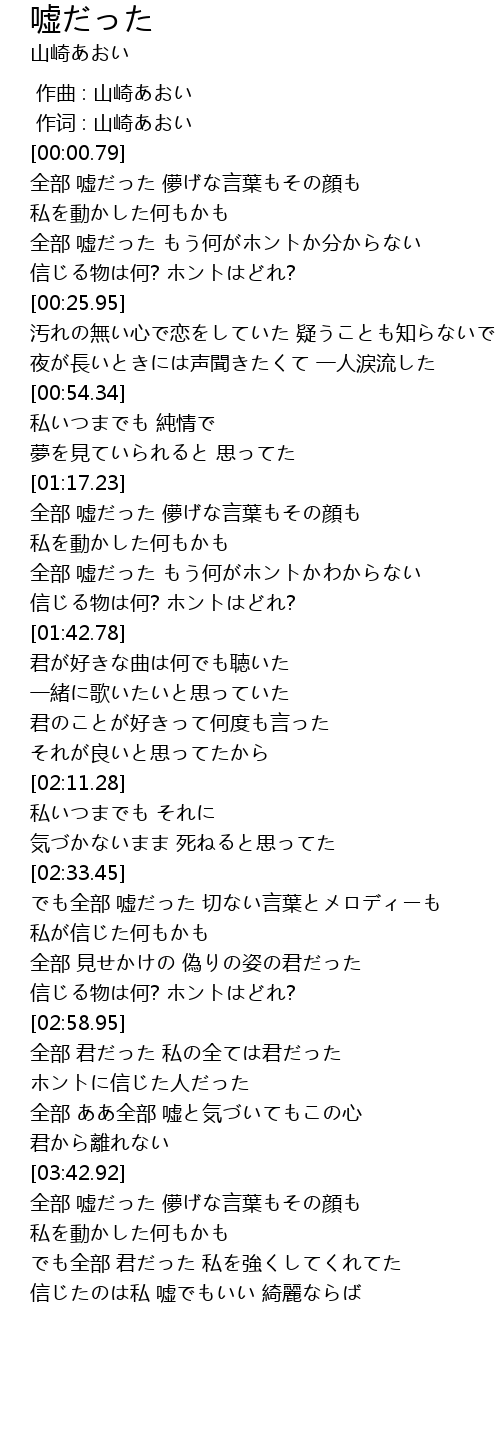 | [02:33.61] | でも全部 嘘だった 切ない言葉とメロディーも |