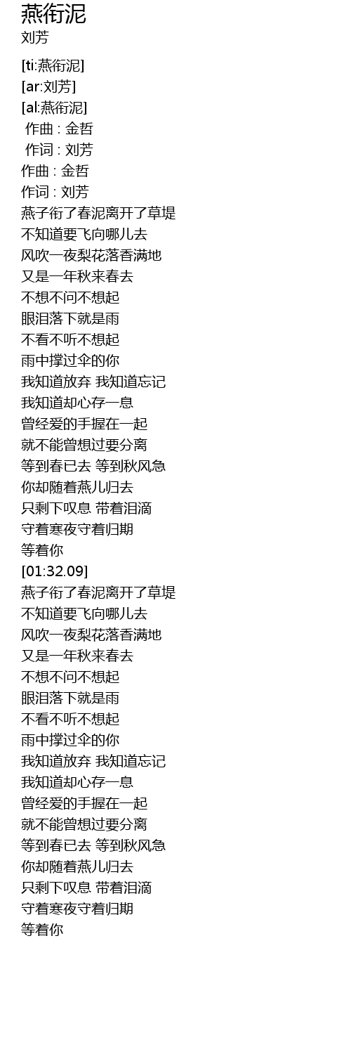 | [01:48.90] | 燕子衔了春泥离开了草堤 |