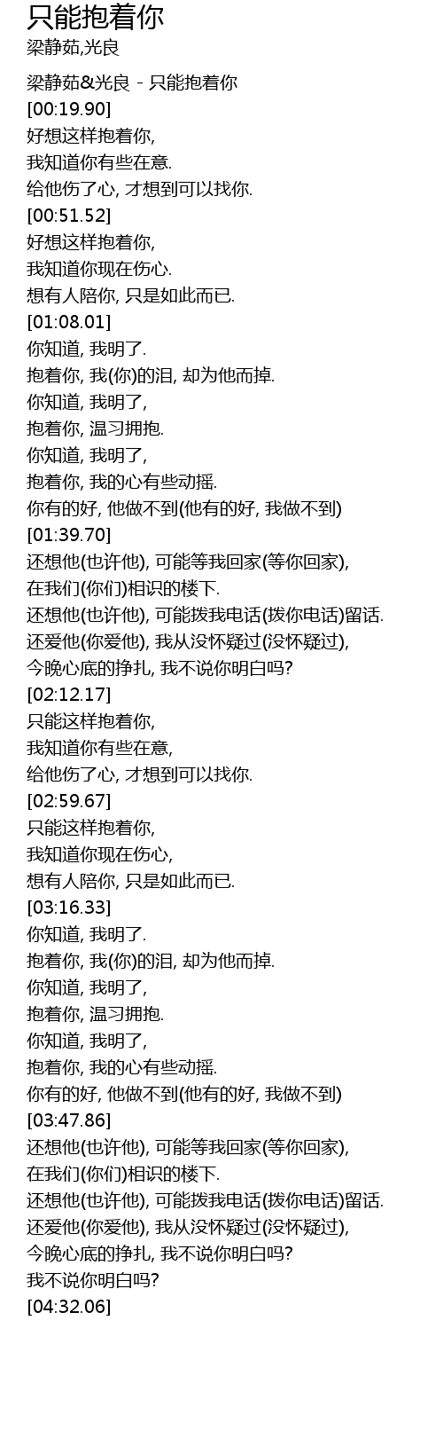 | [00:02.90] | 梁静茹&光良 - 只能抱着你 |