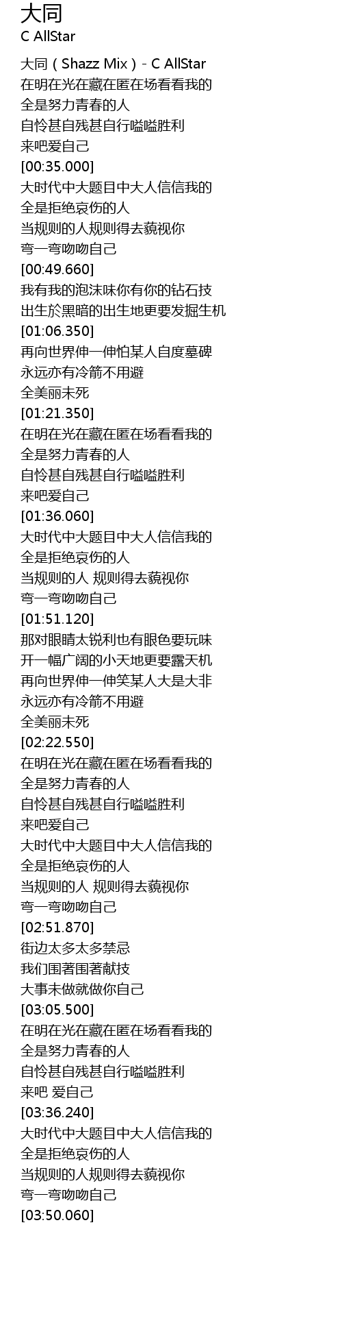 | [00:13.750] | 大同(Shazz Mix)- C AllStar |