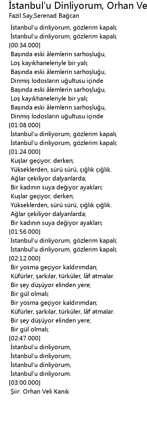 | [01:56.000] | İstanbul'u dinliyorum, gözlerim kapalı; |