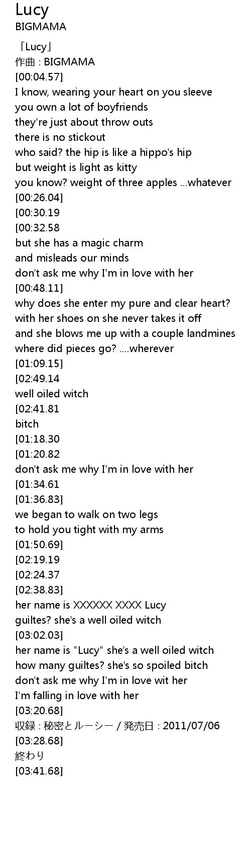 | [02:56.98][02:49.14][02:39.42][01:22.94][01:13.09] | her name is " Lucy" she' s a well oiled witch |