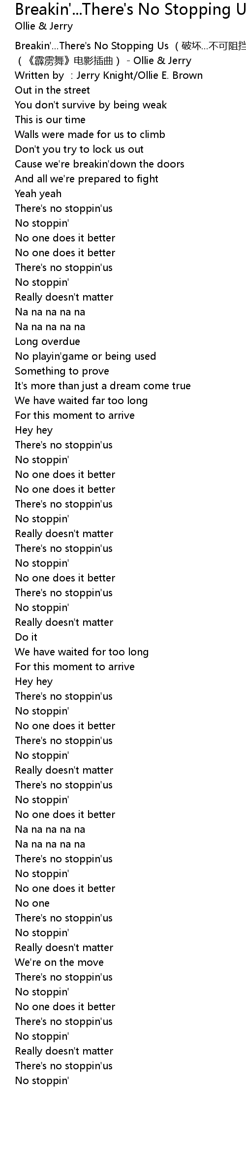 | [00:00.200] | Breakin'... There' s No Stopping Us pò huài... bù kě zǔ dǎng pī lì wǔ diàn yǐng chā qǔ Ollie Jerry |