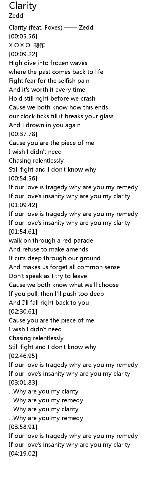 | [00:02.99] | Clarity (feat. Foxes) —— Zedd |