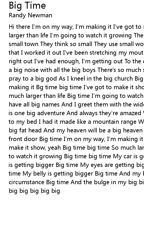 Hi there I'm on my way, I'm making it I've got to make it show, yeah So much larger than life I'm going to watch it growing The place where I come from is a small town They think so small They use small words But not me I'm smarter than that I worked it out I've been stretching my mouth To let those big words come right out I've had enough, I'm getting out To the city, the big big city I'll be a big noise with all the big boys There's so much stuff I will own And I will pray to a big god As I kneel in the big church Big time I'm on my way, I'm making it Bg time big time I've got to make it show, yeah Bg time big time So much larger than life Big time I'm going to watch it growing Big time My parties have all big names And I greet them with the widest smile Tell them how my life is one big adventure And always they're amazed When I show them round my house to my bed I had it made like a mountain range With a snow-white pillow for my big fat head And my heaven will be a big heaven And I will walk through the front door Big time I'm on my way, I'm making it Big time big time I've got to make it show, yeah Big time big time So much larger than life Big time I'm going to watch it growing Big time big time My car is getting bigger Big time My house is getting bigger Big time My eyes are getting bigger Big time And my mouth Big time My belly is getting bigger Big time And my bank account Big time Look at my circumstance Big time And the bulge in my big big big big big big big big big big big big big big |