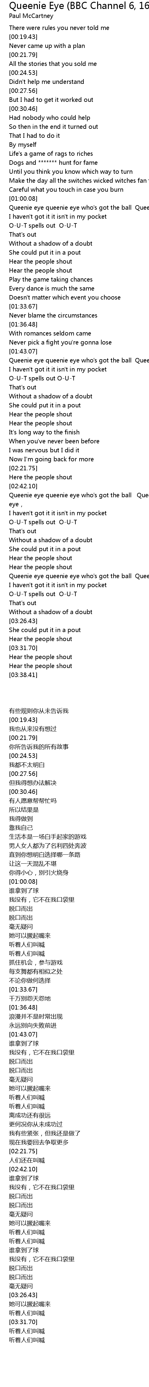 | [01:44.29] | Queenie eye queenie eye who's got the ball Queenie eye queenie eye, |