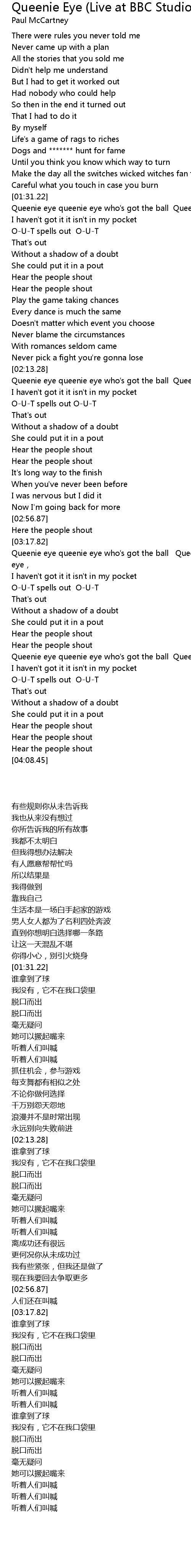 | [02:14.88] | Queenie eye queenie eye who's got the ball Queenie eye queenie eye, |