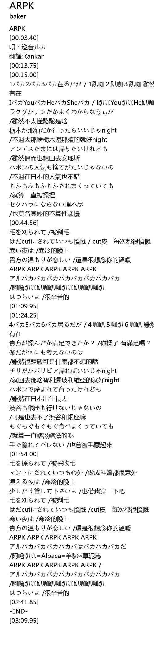 | [01:04.54] | アルパカパカパカパカパカパカパカパカ /阿嚕趴咖趴咖趴咖趴咖趴咖趴咖趴 |
