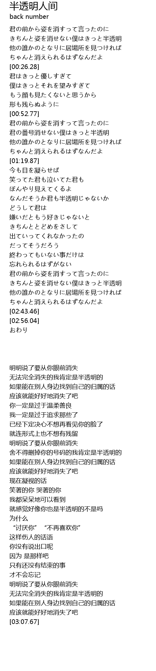 | [01:00.89] | 君の番号消せない僕はきっと半透明 |