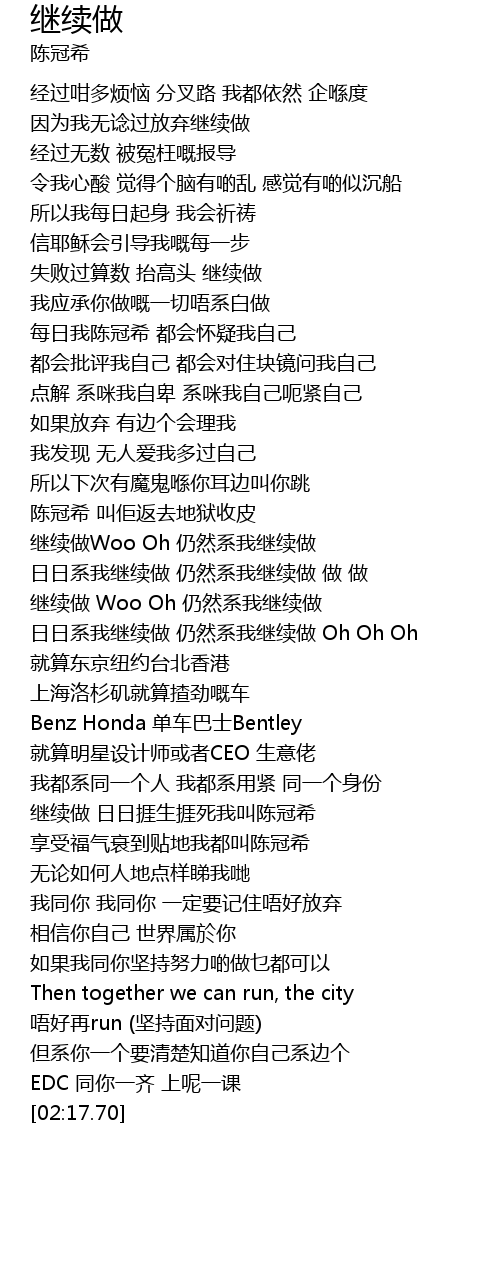| [01:27.36] | 日日系我继续做 仍然系我继续做 Oh Oh Oh |