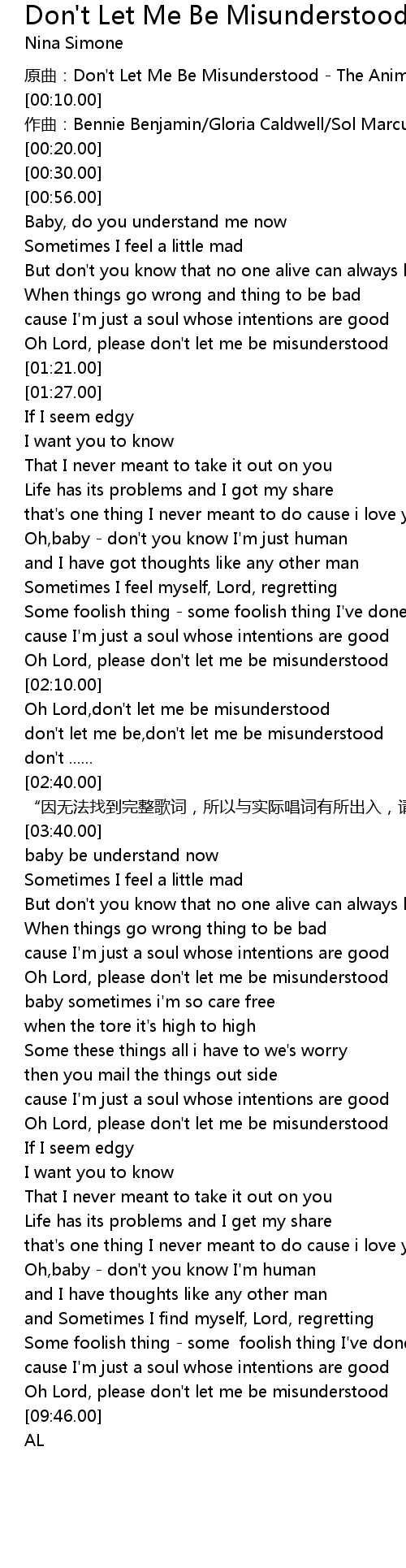 | [09:41.00] | Oh Lord, please don't let me be misunderstood |