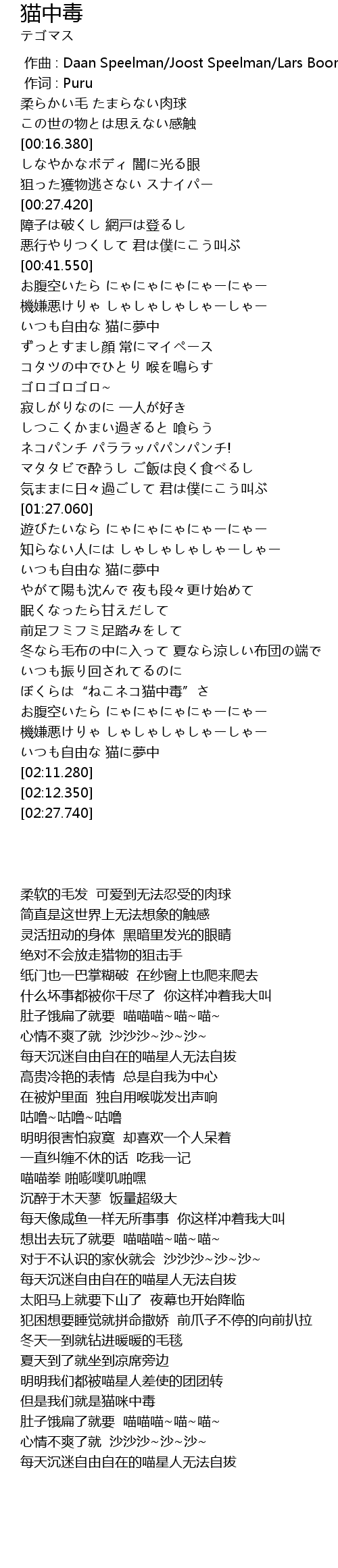 | [01:54.700] | いつも振り回されてるのに ぼくらは“ねこネコ猫中毒”さ |