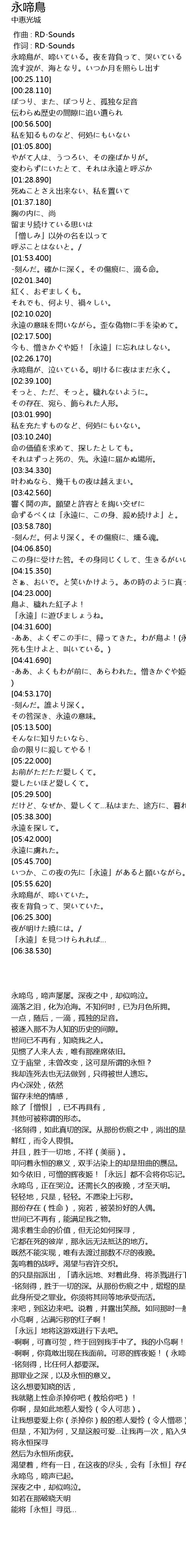 | [00:02.470] | 永啼鳥が、啼いている。夜を背負って、哭いている |