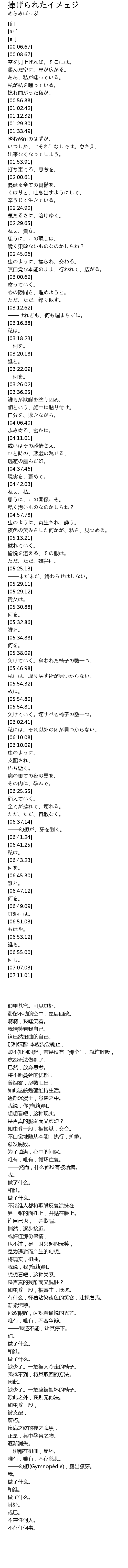 | [05:54.82] | 欠けていく。壊すべき椅子の数一つ。 |