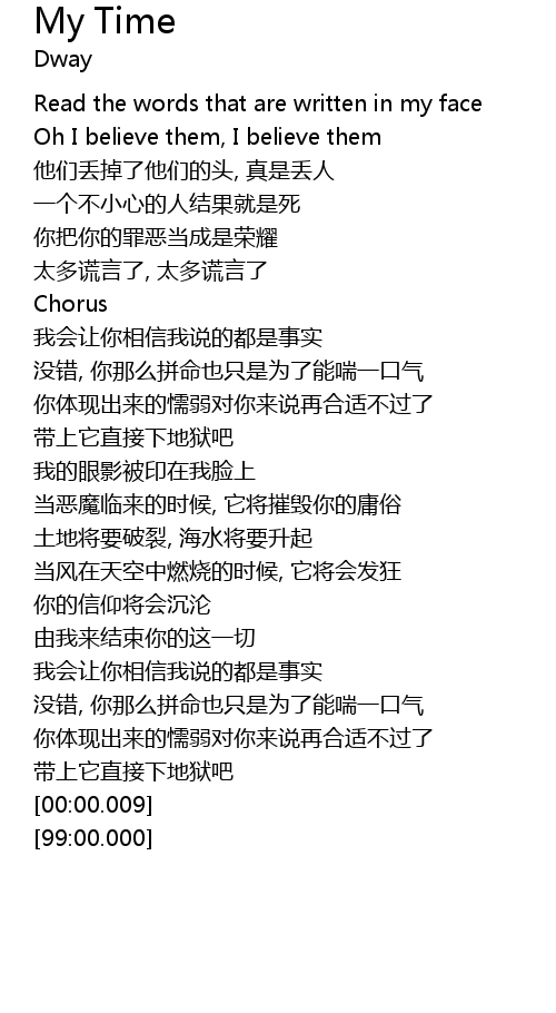 | [01:22.34] | wǒ huì ràng nǐ xiāng xìn wǒ shuō de dōu shì shì shí |