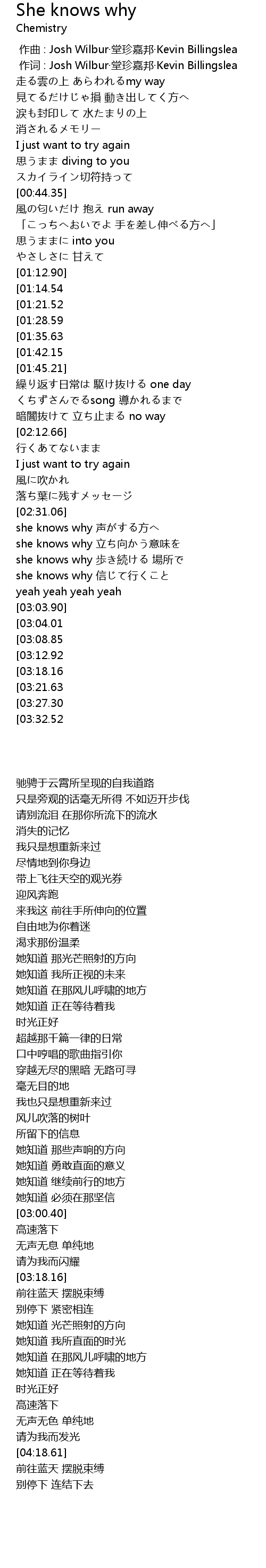 | [03:40.20][01:21.52] | she knows why pú xiàng shí jiān |