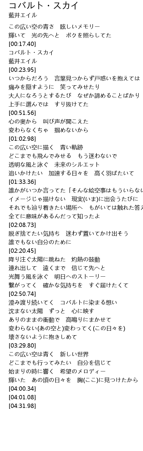 | [02:59.87] | 澄み渡り続いてく コバルトに染まる想い |
