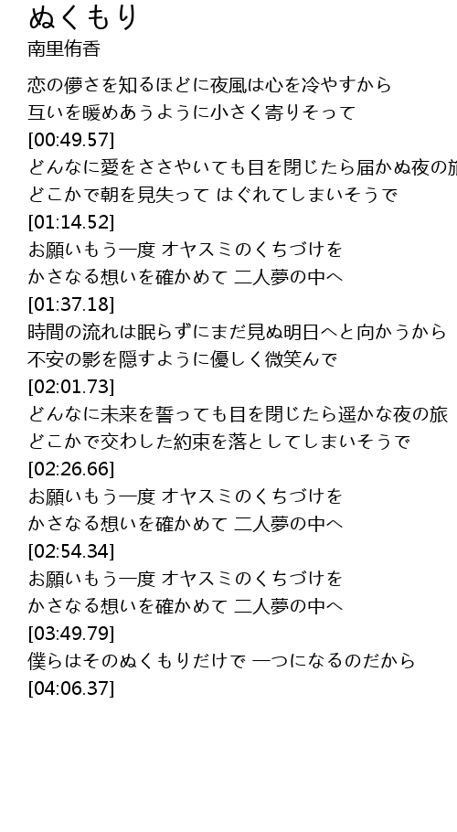 | [03:39.04] | かさなる想いを確かめて 二人夢の中へ |