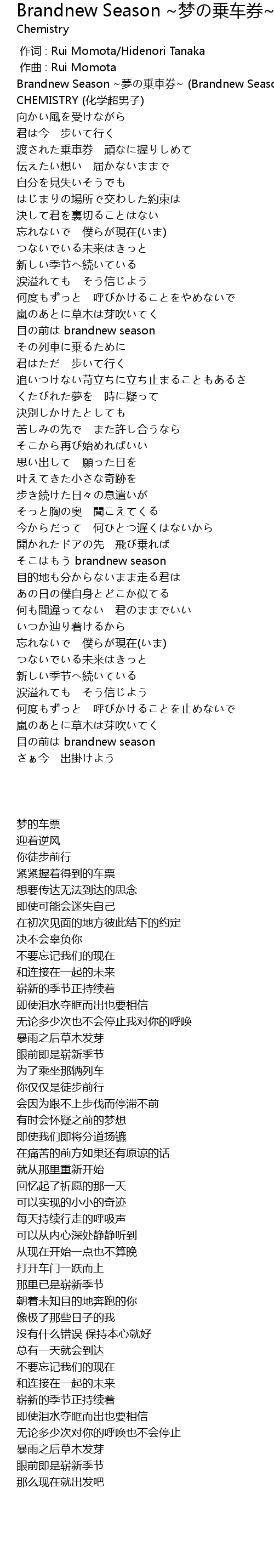 | [00:01.61] | Brandnew Season ~夢の乗車券~ (Brandnew Season ~梦的车票~) - CHEMISTRY (化学超男子) |