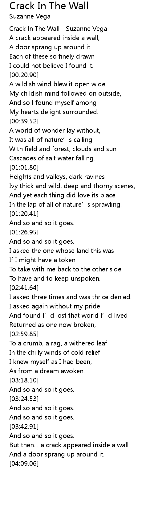 | [00:00.91] | Crack In The Wall Suzanne Vega |