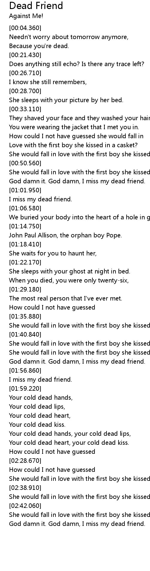 [01:46.800] God damn it. God damn, I miss my dead friend.