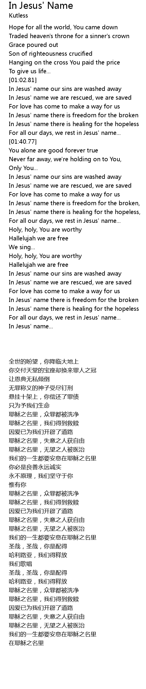 | [01:27.70] | In Jesus' name there is healing for the hopeless |