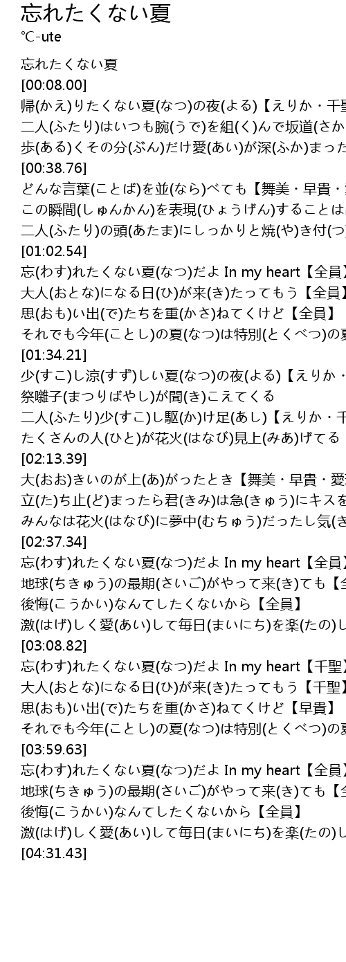| [04:01.17] | 忘(わす)れたくない夏(なつ)だよ In my heart【全員】 |