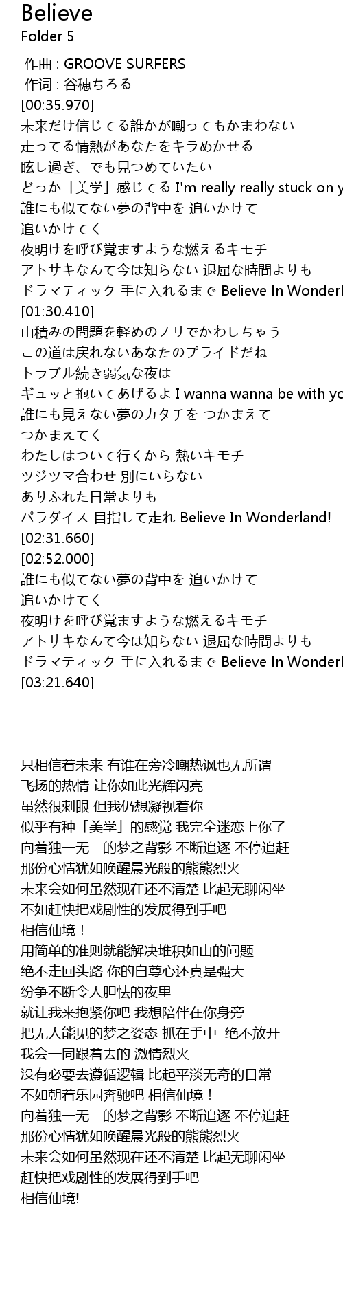 | [03:12.920] | shǒu rù Believe In Wonderland! |