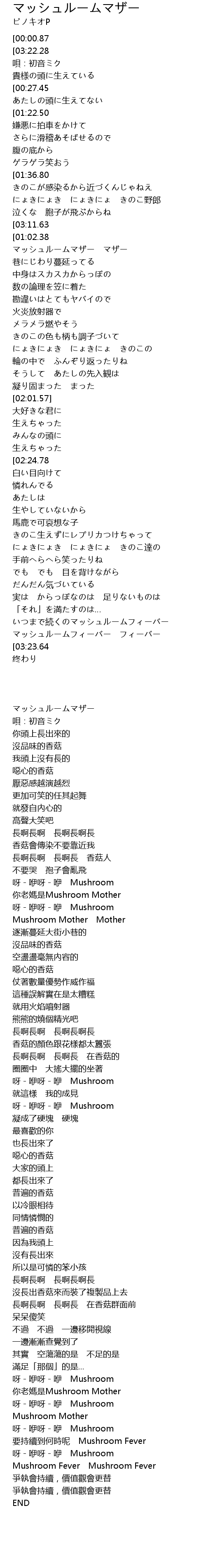 | [03:10.25][00:00.87] | マッシュルームマザー |