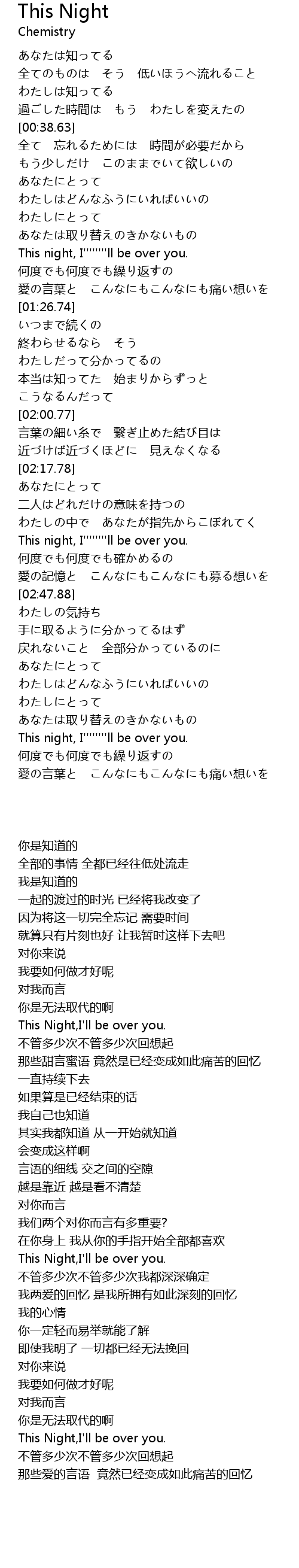 | [02:31.68] | This night, I''''''''ll be over you. |