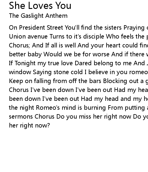 On President Street You'll find the sisters Praying over My city's heart While Union avenue Turns to it's disciple Who feels the pressure heat coming on hard Chorus; And If all is well And your heart could find the words Would be for better baby Would we be for worse And if there was a way To navigate your seas If Tonight my true love Dared belong to me And Juliet she's smoking by the window Saying stone cold I believe in you romeo And the raindrops and the cars Keep on falling from off the bars Blocking out a good song Playing on the radio Chorus I've been down I've been out Had my head and my heart kicked around I've been down I've been out Had my head and my heart kicked around But in quiet of the night Romeo's mind is burning From putting all of his blood Into them sermons Chorus Do you miss her right now Do you miss her right now Do you miss her right now? |