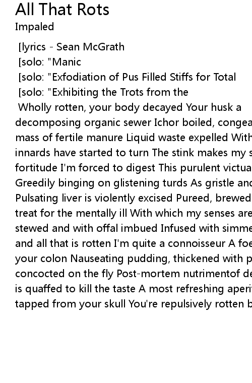 | music Leon del Muerte and Sean McGrath lyrics Sean McGrath solo: " Funerary Feast on the Recently Deceased" by S. C. McGrath solo: " Manic Rottraphagia" L. d. Muerte solo: " Exfodiation of Pus Filled Stiffs for Total Gormandization" by S. C. McGrath solo: " Exhibiting the Trots from the Consumption of Rot" by L. d. Muerte Wholly rotten, your body decayed Your husk a decomposing organic sewer Ichor boiled, congealed, and reduced Into a fustular mass of fertile manure Liquid waste expelled With a nauseating smell Your innards have started to turn The stink makes my sinuses burn With intestinal fortitude I' m forced to digest This purulent victual with which I' m obsessed Greedily binging on glistening turds As gristle and fat form globular curds Pulsating liver is violently excised Pureed, brewed, and mulled A gustatory treat for the mentally ill With which my senses are dulled Your kidneys are stewed and with offal imbued Infused with simmering gore Of carbonized entrails and all that is rotten I' m quite a connoisseur A foetid tapioca is prepared in your colon Nauseating pudding, thickened with pus A genital souffle is concocted on the fly Postmortem nutrimentof decomposing guts Putrescine elixir is quaffed to kill the taste A most refreshing aperitif The noxious beverage is tapped from your skull You' re repulsively rotten beyond belief |