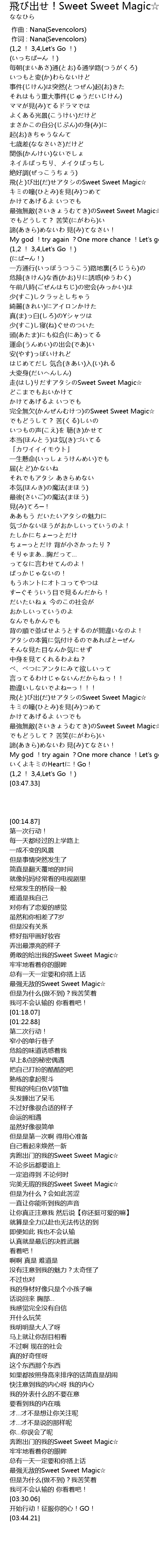 | [03:08.25] | 飛(と)び出(だ)せアタシのSweet Sweet Magic☆ |