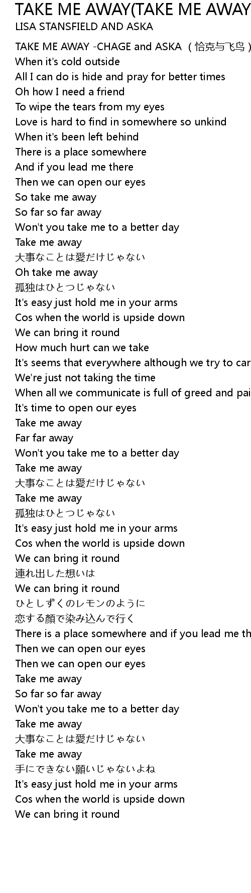 | [00:00.200] | TAKE ME AWAY -CHAGE and ASKA (恰克与飞鸟) |