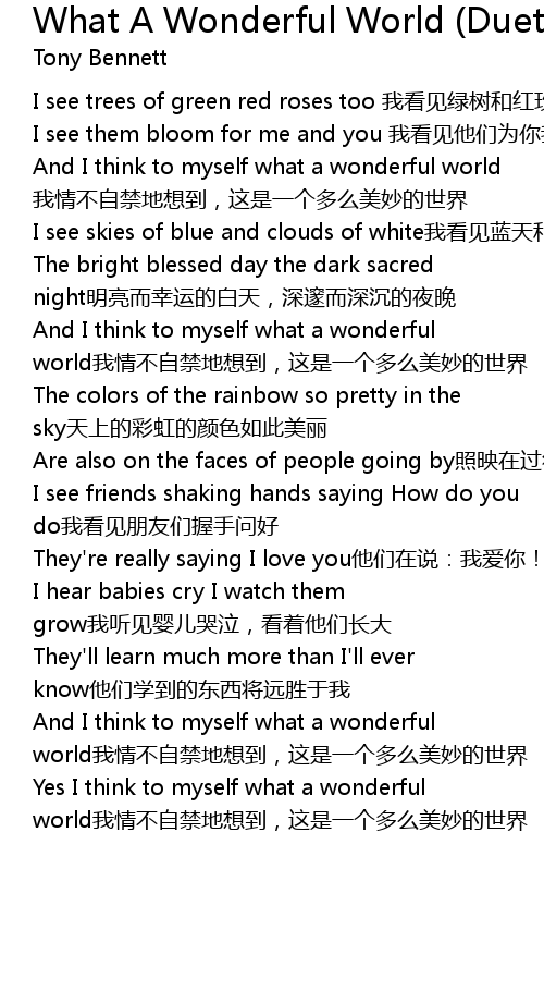 | [01:53.31] | Yes I think to myself what a wonderful world wǒ qíng bù zì jīn dì xiǎng dào, zhè shì yí gè duō me měi miào de shì jiè |