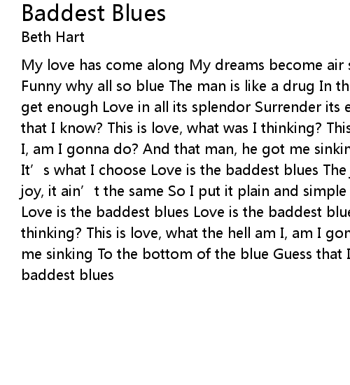 | My love has come along My dreams become air so My days have arrived, yea sunny Funny why all so blue The man is like a drug In the late night when I can' t get enough Love in all its splendor Surrender its every blow Where is the blues that I know? This is love, what was I thinking? This is love, what the hell am I, am I gonna do? And that man, he got me sinking To the bottom of the blue It' s what I choose Love is the baddest blues The joy versus the kind No, my joy, it ain' t the same So I put it plain and simple Just like front page news Love is the baddest blues Love is the baddest blues This is love, what was I thinking? This is love, what the hell am I, am I gonna do? And that man, he got me sinking To the bottom of the blue Guess that I, I' ll lose Love is the baddest blues |