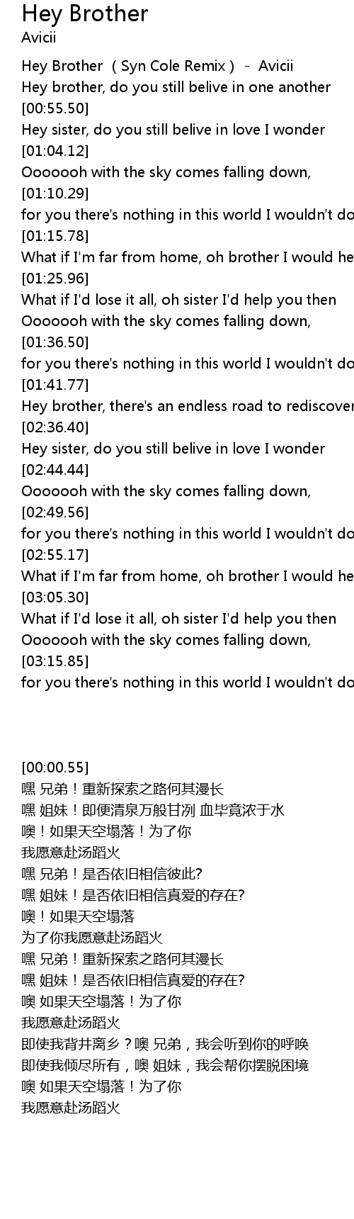 | [00:00.55] | Hey Brother (Syn Cole Remix) - Avicii |