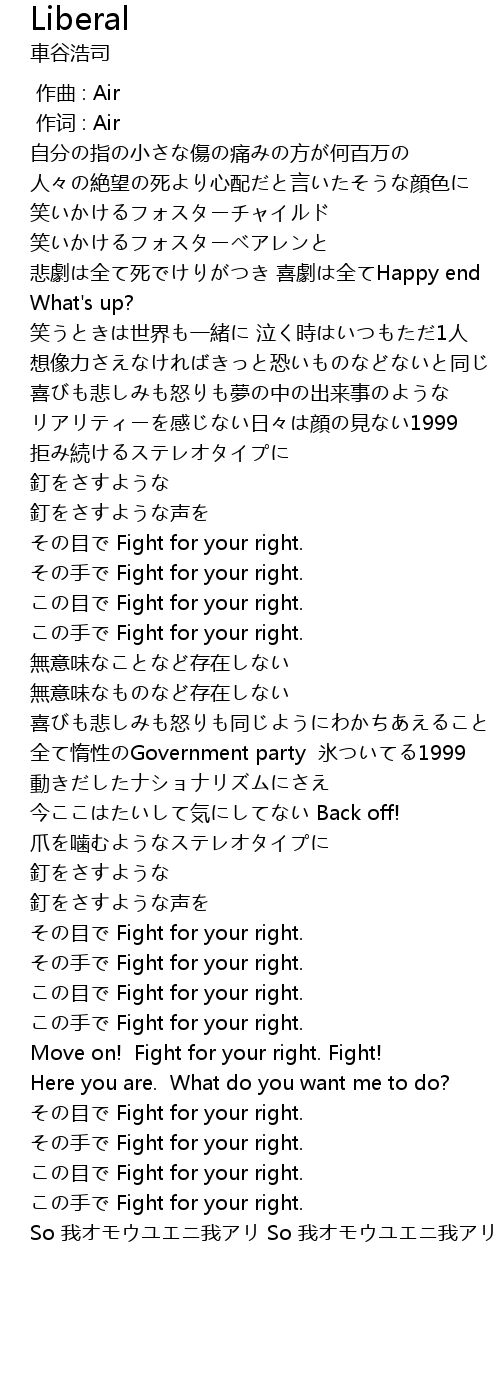 | [02:02.070] | 動きだしたナショナリズムにさえ 今ここはたいして気にしてない Back off! |