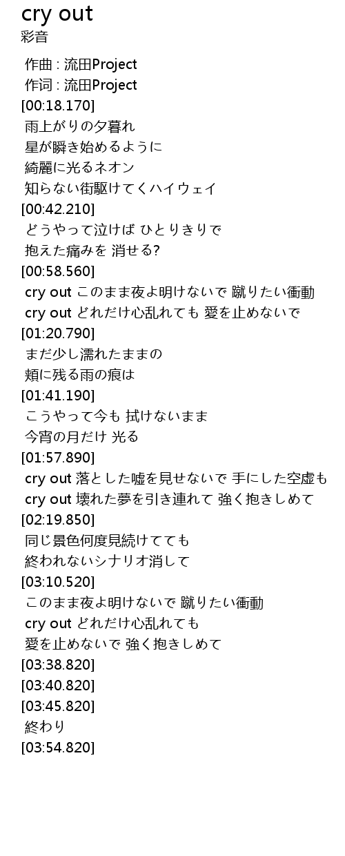 | [00:59.290] | cry out このまま夜よ明けないで 蹴りたい衝動 |