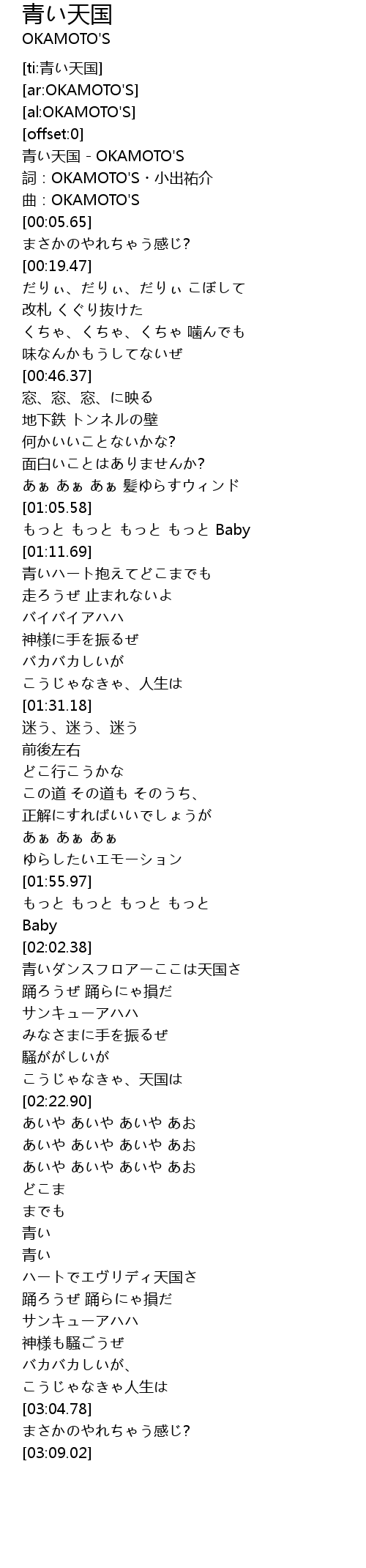 | [00:00.91] | 青い天国 - OKAMOTO'S |