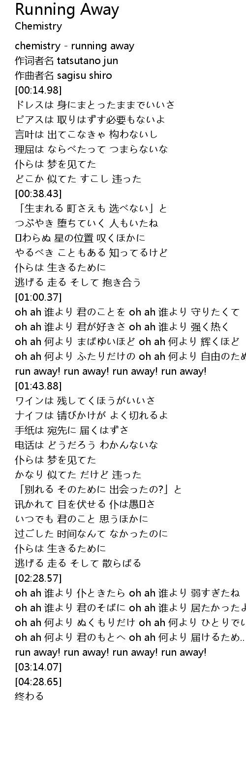 | [00:56.77] | 逃げる 走る そして 抱き合う |