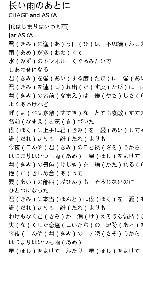 | [00:44.488] | 君(きみ)を連(つ)れ出(だ)す度(たび)に 雨(あめ)が包(つつ)んだ |