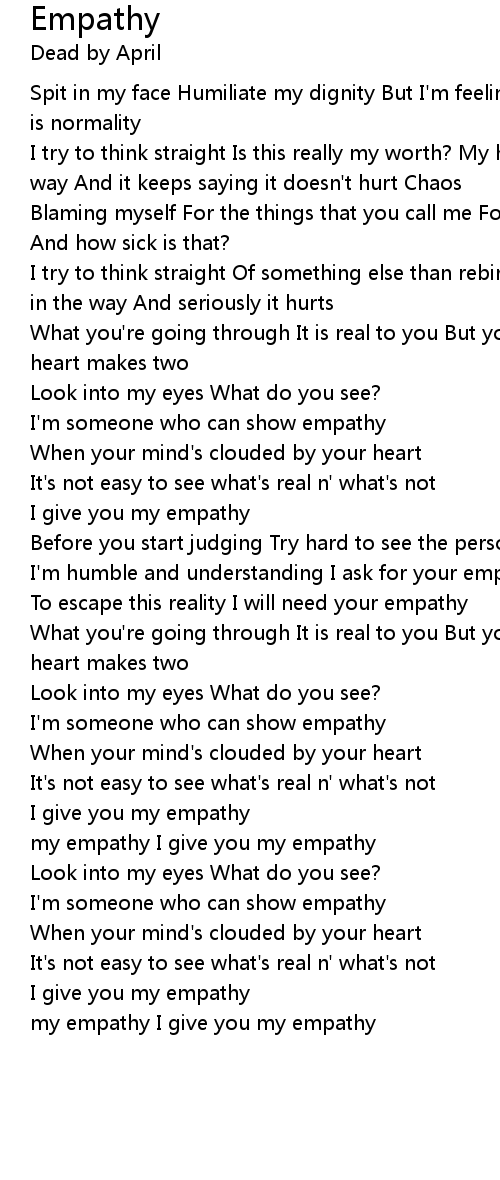Before you start judging Try hard to see the person I am I'm caring I'm humble and understanding I ask for your empathy To think of me as friendly To escape this reality I will need your empathy |