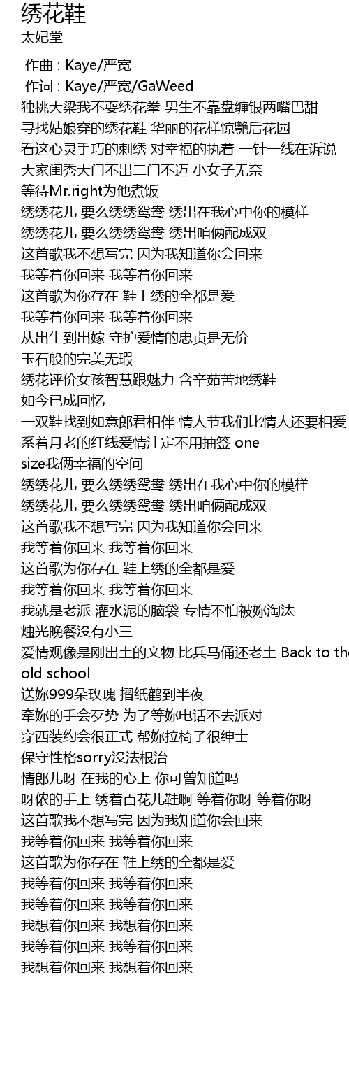 | [01:53.22] | 这首歌为你存在 鞋上绣的全都是爱 |